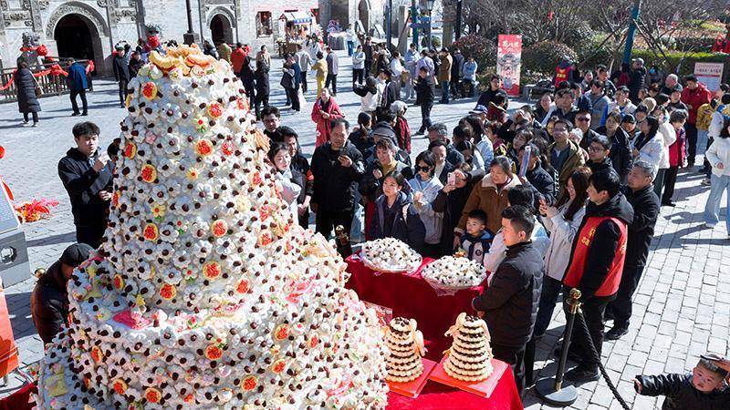 亳州花戏楼景区,古韵与民俗相融。2.5米高的巨型枣花山气势恢宏,成为新春打卡地标,尽显非遗魅力。街巷间,“送大馍”习俗温情流淌,邻里相互馈赠传递烟火暖意。