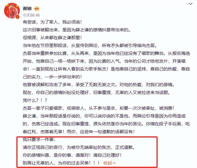 谢娜的诉求很简单,就是希望薛之谦正视自己的言行,为无端牵扯的张杰正式道歉,也希望他能自己处理好感情纠葛,别再让无辜的人为他的过去买单。