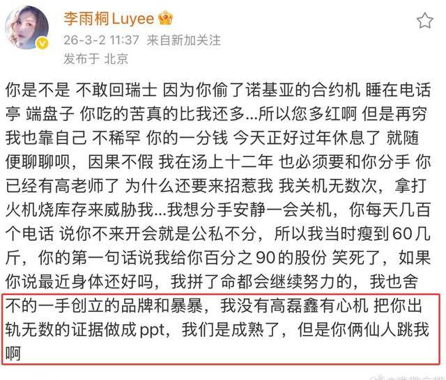 事情的起因要从3月2日说起,李雨桐突然在微博实名喊话薛之谦,不仅指控高磊鑫手握薛之谦的出轨证据并做成PPT,还在爆料里牵扯出薛之谦私下评价张杰唱歌土的言论。