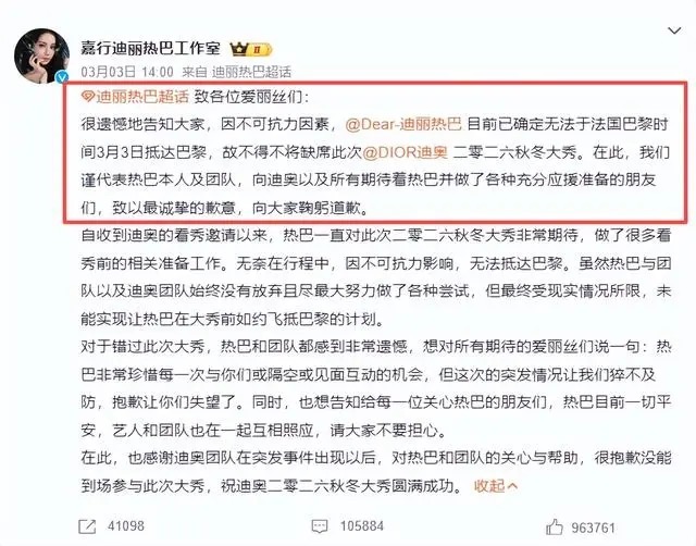 可就在3月3日下午,她的工作室突然发声明,说因为不可抗力,迪丽热巴没法按时抵达巴黎,只能缺席这次大秀。